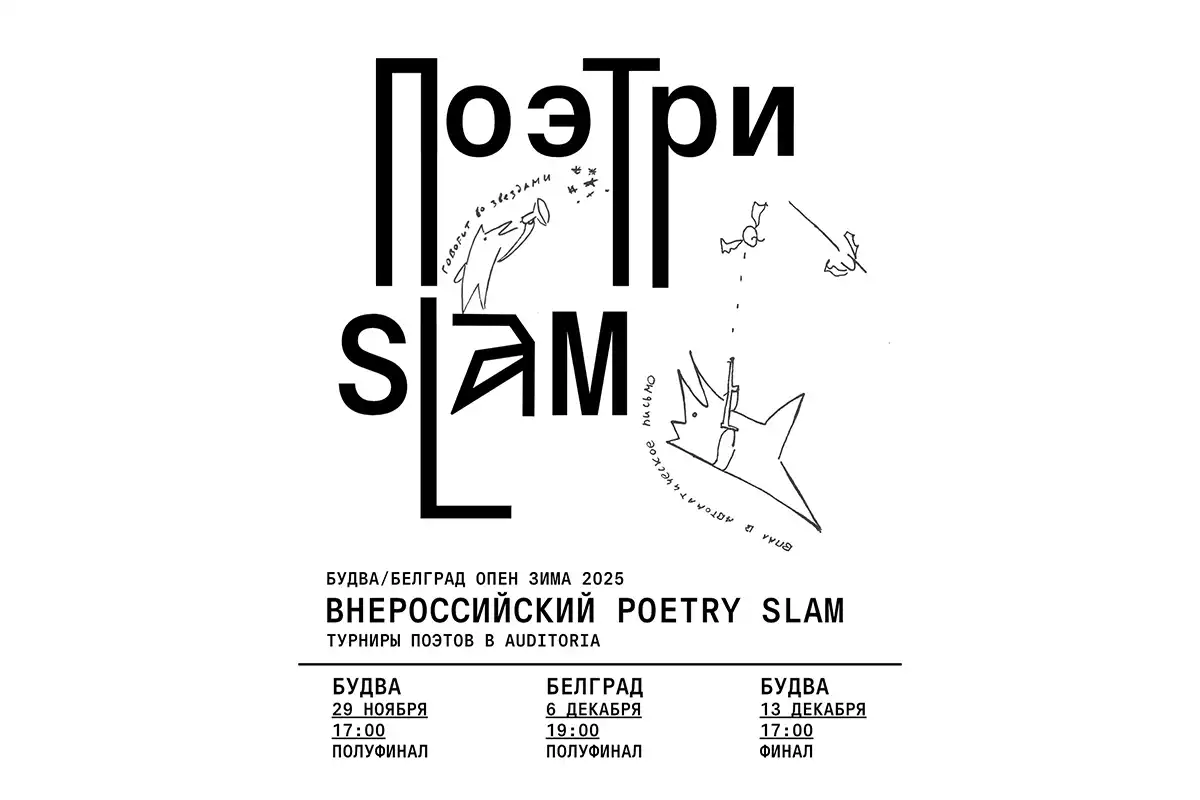 В ноябре и декабре 2025 года стартует Внероссийский Poetry Slam — Будва / Белград Open Зима 2025 — серия открытых поэтических турниров, где победителя выбирает публика. Это самая демократичная и энергичная форма литературной сцены, где участвуют поэты любого статуса: от мастеров до тех, кто впервые выходит перед аудиторией.